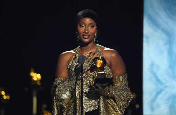 LOS ANGELES, CALIFORNIA – FEBRUARY 02: (FOR EDITORIAL USE ONLY) Tems accepts the Best African Music Performance award for “Love Me JeJe” onstage during the 67th GRAMMY Awards Premiere Ceremony at Peacock Theater on February 02, 2025 in Los Angeles, California. (Photo by Amy Sussman/Getty Images)