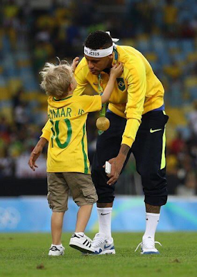 Adorable photos showing Neymar kissing cute son Davi Lucca to celebrate Rio 2016 success have just been released after Neymar inspired the host nation to win Gold in the Football event at the just concluded Rio 2016 Olympics.