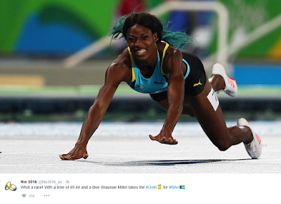Bahamian Shaunae Miller won a gold medal by diving towards the end of the race. She beat American Allyson Felix, who was obviously the favorite to win the race but came second on Monday in the 400 meters race. Thereby preventing Felix from getting a record fifth gold medal. She won the Gold by diving across the finish the line to win by .07 seconds.