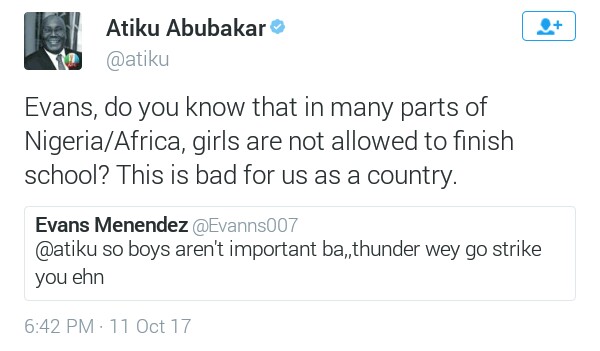 A twitter user had taken to the social media app to invoke the god of thunder on the presidential aspirant but instead of a hateful response, Atiku replied politely.