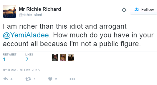 So, Twitter user @richie_slord was blasting Yemi Alade today, claiming he has more money than the singer.