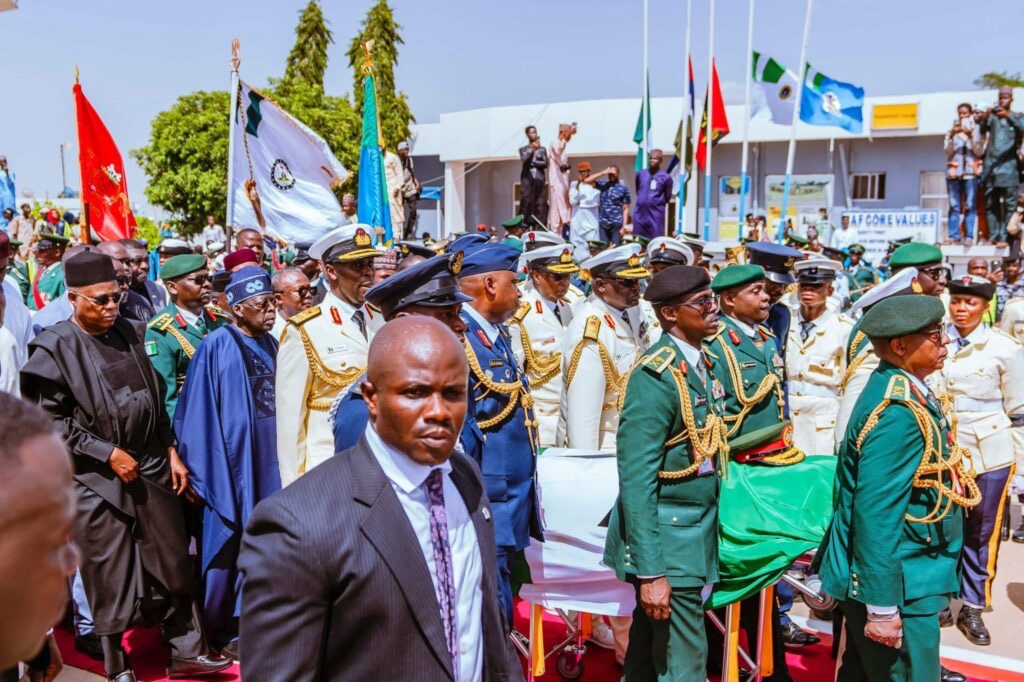 The team laid the casket, draped with the Nigerian flag, on a trolley and wheeled it in a slow march, synchronized with the hymn “God Be With You Till We Meet Again.” They passed through a full military guard of honor, comprising six officers and 96 soldiers drawn from the Nigerian Armed Forces.