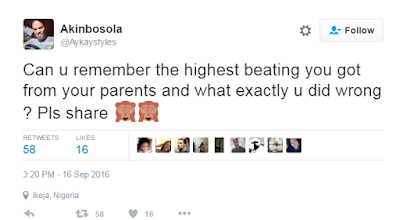 NEWS Check out the hilarious response to this tweet By niyidaram Posted on October 14, 2016 Share Tweet Share Share Email Comments Lol! Guys, can u remember the highest beating you got from your parents and what exactly u did wrong ? Like this:Like Loading... Related Items: Share Tweet Share Share Email Click to comment Leave a Reply Cancel replyYour email address will not be published. Required fields are marked *Comment * Name * Email * Website Δ