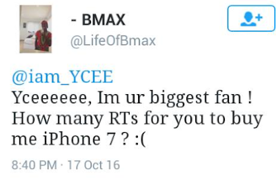 NEWS Check out YCEE’s epic response to a fan who wanted an iPhone 7 By niyidaram Posted on October 19, 2016 Share Tweet Share Share Email Comments A fan asked rapper, YCEE on twitter, to buy him an iPhone 7 and he got an epic response from the rapper. Read his response after the cut… Like this:Like Loading... Related Items: Share Tweet Share Share Email Click to comment Leave a Reply Cancel replyYour email address will not be published. Required fields are marked *Comment * Name * Email * Website Δ