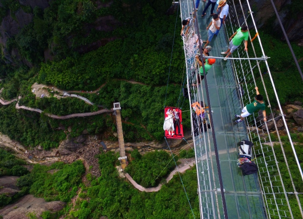 A Chinese couple marked their wedding day in their own special way by dangling underneath a glass bottom suspension bridge overlooking a deep valley.
