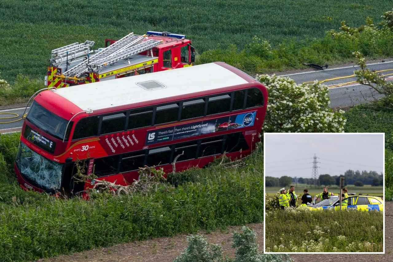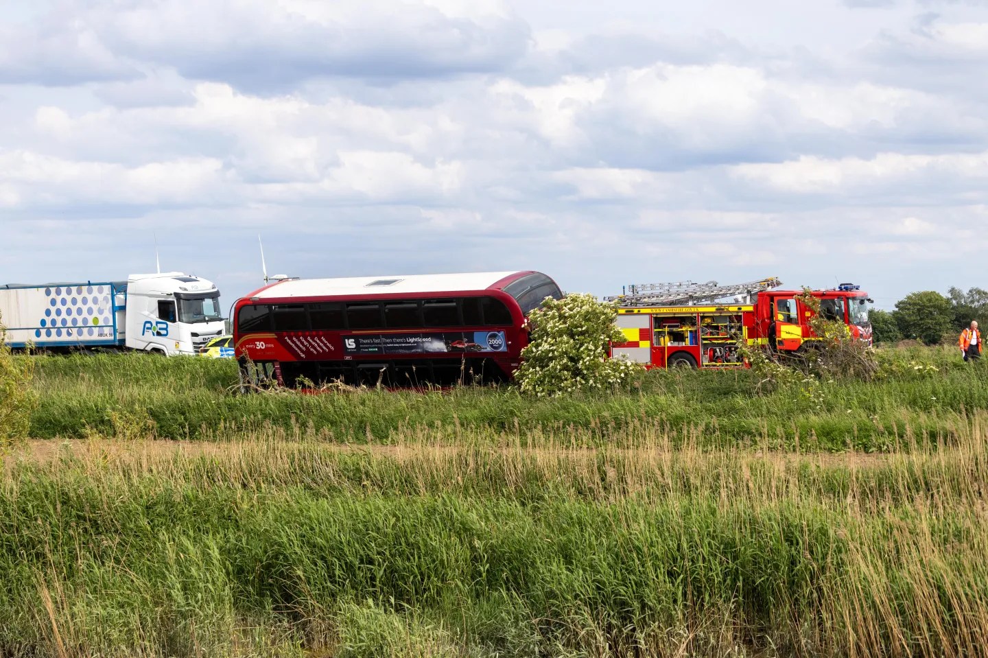 While the exact circumstances of the crash are still being investigated, a double-decker bus can be seen lying in a field next to the road, with its windscreen smashed.