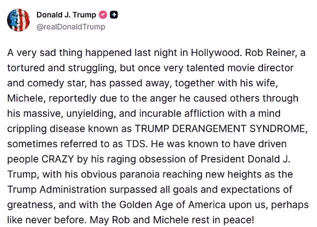 Trump described Reiner as a “once very talented movie director and comedy star,” claiming his death was “reportedly due to the anger he caused others through his massive, unyielding, and incurable affliction” with what Trump labeled TDS.