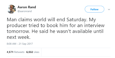 This tweet has been trending for one funny reason.Popular Canadian broadcaster, Aaron Rand said his producer contacted the neurologist who claims the world will end tomorrow, for an interview.The man said he won”t be available till next week.