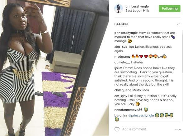 NEWS ‘How do married women manage men with small cassava’ – Actress, Princess Shyngle asks By niyidaram Posted on January 28, 2017 Share Tweet Share Share Email Comments Ghana-based Gambian actress, Princess Shyngle took to her IG page yesterday to ask how women that are married to men with small cassava manage. From the look of things, the curvy actress is obviously a fan of big cassava. Like this:Like Loading... Related Items: Share Tweet Share Share Email Click to comment Leave a Reply Cancel replyYour email address will not be published. Required fields are marked *Comment * Name * Email * Website Δ