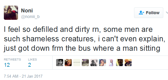 Noni took to Twitter yesterday to narrate how a man seating beside her in a commercial bus was continuously touching her with what she initially thought was a bag. To her horror, she discovered he was actually poking her with his penis while watching porn on his phone. What a pervert! See the rest of her tweet after the cut…