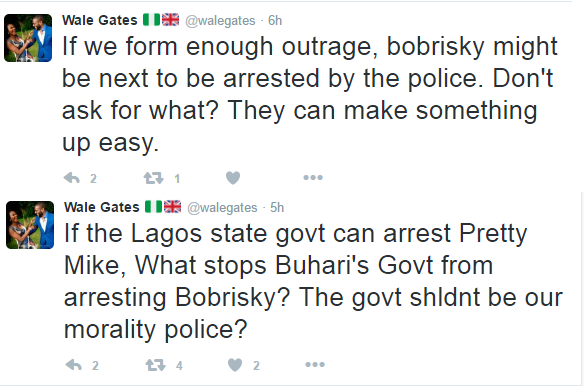NEWS If Lagos govt can arrest Pretty Mike,what stops Buhari’s Govt from arresting Bobrisky? By niyidaram Posted on January 12, 2017 Share Tweet Share Share Email Comments From comedian,Wale Gates following Pretty Mike’s arrest……. Like this:Like Loading... Related Items: Share Tweet Share Share Email Click to comment Leave a Reply Cancel replyYour email address will not be published. Required fields are marked *Comment * Name * Email * Website Δ