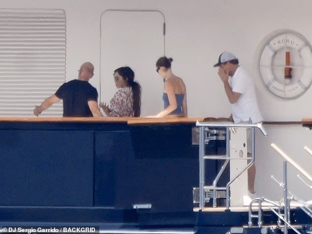 The two couples previously vacationed together last summer in Sardinia, and now reunited on deck dressed for comfort. DiCaprio, 50, wore a simple white T-shirt, shorts, and his usual cap and sunglasses, while 27-year-old Vittoria sported a strapless blue top and black yoga pants.