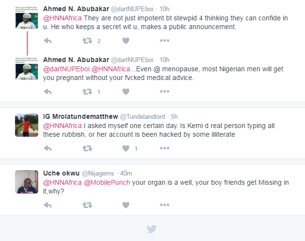 In reaction to a tweet by Punch which reads “Not everybody has perfect sense organs”, Kemi Olunloyo, saw this as an opportunity to express what she feels about Nigerian men . See tweet below.