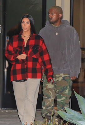 Kardashian was photographed with an understated glam look in an oversize red-and-black plaid shirt, ,while Kanye opted for a dark gray hoodie, camouflage pants and black boots from his Yeezy collection