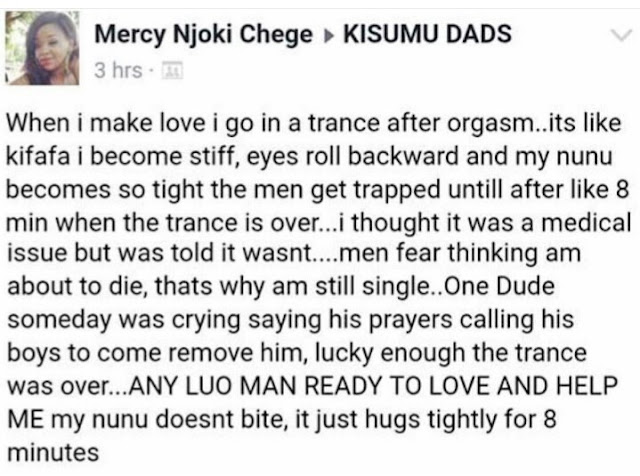 NEWS Lady reveals that any man who sleeps with her gets trapped for 8 minutes after sex By niyidaram Posted on January 20, 2017 Share Tweet Share Share Email Comments A Kenyan lady, Mercy Njoki Chege took to her Facebook to reveal what happens to her during and after sexual intercourse with men. Like this:Like Loading... Related Items: Share Tweet Share Share Email Click to comment Leave a Reply Cancel replyYour email address will not be published. Required fields are marked *Comment * Name * Email * Website Δ