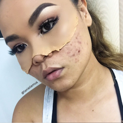 While many were shocked at the cake of make-up she uses to cover her acne,others called it deception and said she needs to let her face breathe so an can treat the acne instead of masking it up..