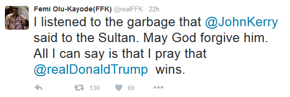 NEWS May God Forgive You-Fani Kayode Blasts John Kerry Over Statement To Sultan Of Sokoto By niyidaram Posted on August 24, 2016 Share Tweet Share Share Email Comments Fani Kayode reacted to US secretary of State ,John Kerry praising the Sultan of Sokoto for “promoting religious tolerance” in Nigeria..Fani Kayode also says he prays Donald Trump wins.. Like this:Like Loading... Related Items:Celebrities Share Tweet Share Share Email Recommended for you Aerial Video Shows LA Fires Approaching Homes Lori Harvey Wants Ya’ll To ‘Leave Her Alone’ About Dating ‘Mufasa’ Star Aaron Pierre Patience won’t go scot-free if found guilty –EFCC Click to comment Leave a Reply Cancel replyYour email address will not be published. Required fields are marked *Comment * Name * Email * Website Δ