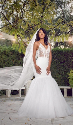 Kevin Hart’s new wife Eniko Parrish wore a custom Vera Wang dress for her wedding to Kevin Hart on Saturday, August 13 in Santa Barbara, CA. For her reception, she wore a custom long sleeve light ivory sheer lace gown with sumptuous hand placed French Chantilly lace appliqué artfully contoured along the entire gown. More photos after the cut…