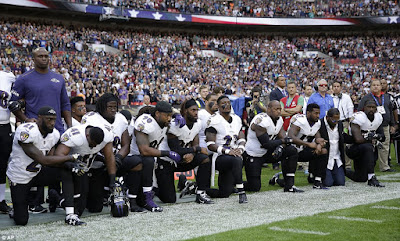 Players from both Jacksonville Jaguars and the Baltimore Ravens dropped to their knees as the national anthem was played prior to the match in London.