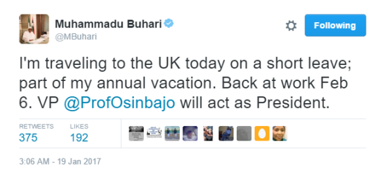 Nigerians have reacted to the news of President Buhari planned 2 weeks vacation to United Kingdom. A lot of people believe it is insensitive for him to travel for vacation few days after a Military jet mistakenly released a bomb on Rann IDP camp which killed over 50 persons and injured many more. Read some of their reactions below …