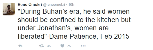 NEWS Reno Omokri Remembers Patience Jonathan’s Quote On Buhari & The Kitchen By niyidaram Posted on October 16, 2016 Share Tweet Share Share Email Comments The former first lady was said to have made those quotes in 2015 while campaigning for her husband. One of her husband’s aides tweeted them this morning, reminding Nigerians Patience wasn’t joking then. Like this:Like Loading... Related Items: Share Tweet Share Share Email Click to comment Leave a Reply Cancel replyYour email address will not be published. Required fields are marked *Comment * Name * Email * Website Δ