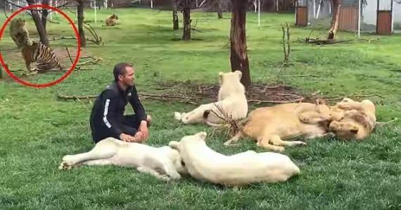 Eduardo Serio, a zookeeper at the Black Jaguar White Tiger zoo in Mexico City was saved from a potential leopard attack by a tiger. A video of the dramatic incident shows Serio playing with a group of six lions around him oblivious to the danger behind as Dharma the leopard tries to sneak up on him.Aztlan the tiger sees the danger however and stops Dharma in its stride which earns him a thankful pat from Serio. More photos after the cut…