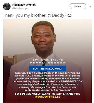 Leke, last son and Senior Personal Assistant of Pastor Adeboye, has taken to social media to thank controversial media personality, Daddy Freeze.