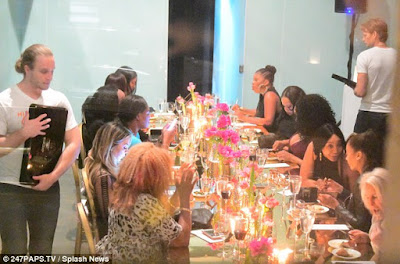 Serena, her sister Venus, mother Oracene, friends Ciara & Lala Anthony and other guests took a party bus to a resturant for dinner. The venue was decorated with flowers, a balloon shaped like an engagement ring and had a four-tier cake covered in pink frosting and sparkly decorations.