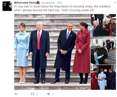 NEWS The importance of choosing wisely-Toni Payne says as she shares photo of The Obamas and the Trumps By niyidaram Posted on January 23, 2017 Share Tweet Share Share Email Comments 9ice’s ex-wife, Toni Payne has joined those who have criticized Trump for being non-affectionate towards his wife, Melania ..She says this has solidified a lesson she learnt the hard way on choosing wisely .. Like this:Like Loading... Related Items: Share Tweet Share Share Email Click to comment Leave a Reply Cancel replyYour email address will not be published. Required fields are marked *Comment * Name * Email * Website Δ