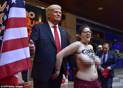 A topless activist from a feminist group grabbed a life-size waxwork of US President-elect Donald Trump by the balls yesterday, hijacking an unveiling ceremony in Madrid.