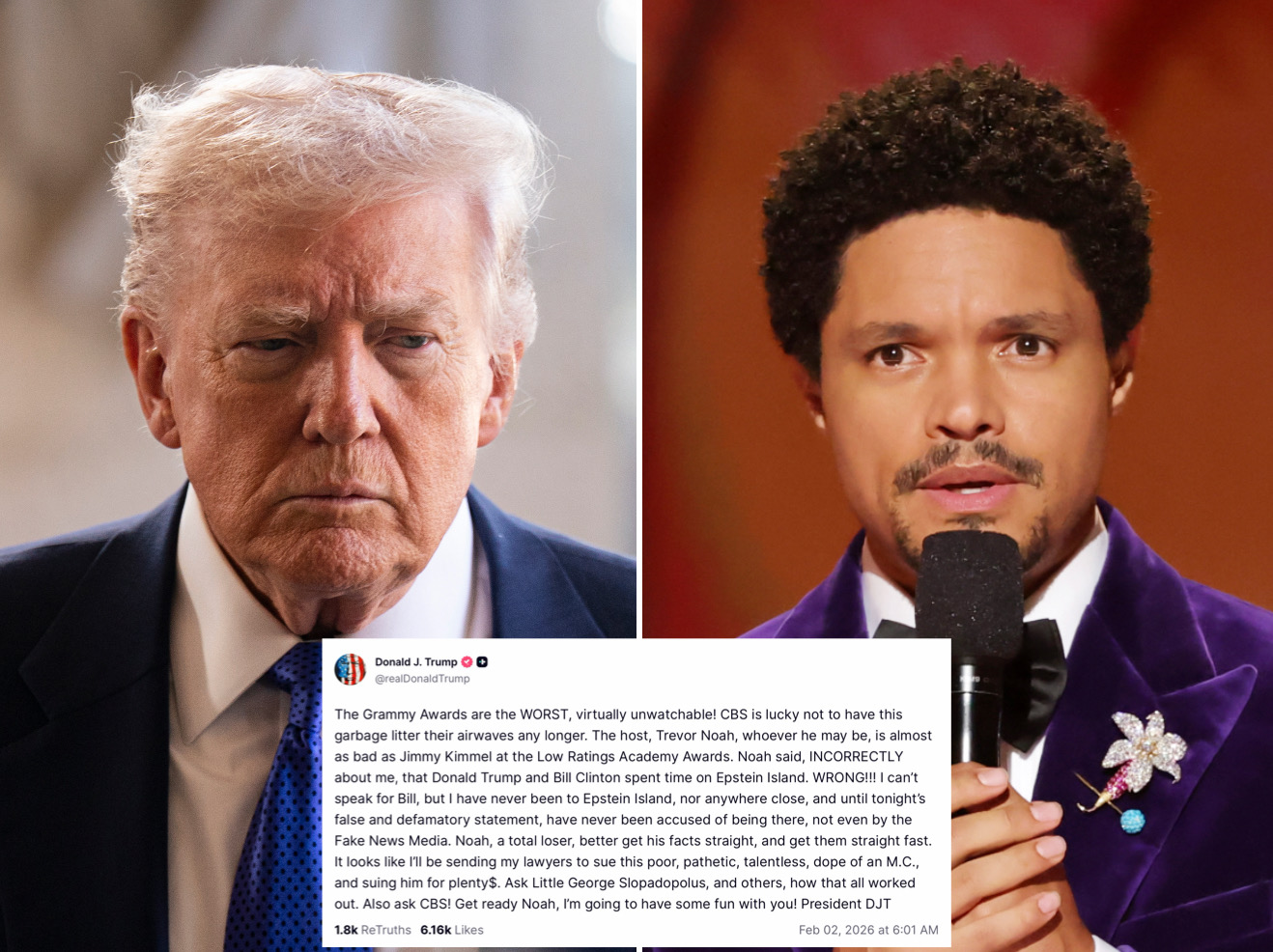 Donald Trump has threatened to sue Trevor Noah following remarks made by the comedian at the 2026 Grammy Awards.