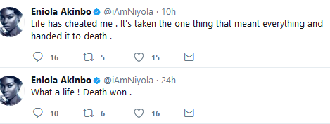 NEWS Tweets: Singer Niyola Is Bereaved… By niyidaram Posted on September 1, 2017 Share Tweet Share Share Email Comments She took to Twitter to write ‘What A Life! Death Won’ Then hours later, she was back to say life has cheated her. May God console her. Like this:Like Loading... Related Items: Share Tweet Share Share Email Click to comment Leave a Reply Cancel replyYour email address will not be published. Required fields are marked *Comment * Name * Email * Website Δ