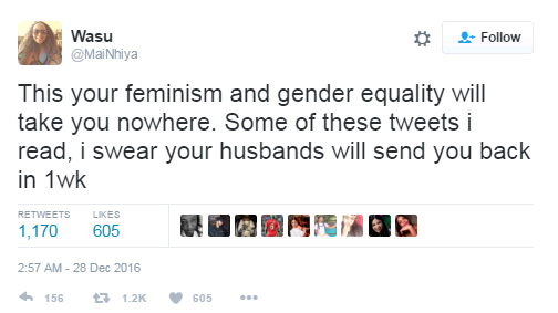 NEWS Twitter user slams ‘feminists’ reminds them of how to keep a home By niyidaram Posted on December 30, 2016 Share Tweet Share Share Email Comments Twitter user, @MaiNhiya has slammed feminists and gender equality in Nigeria, saying wives are meant to “take good care of the home”. Continue to read her tweets after the cut… Like this:Like Loading... Related Items: Share Tweet Share Share Email Click to comment Leave a Reply Cancel replyYour email address will not be published. Required fields are marked *Comment * Name * Email * Website Δ