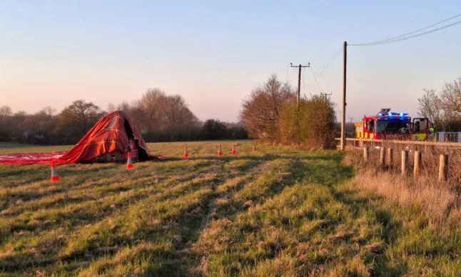 The AAIB said the basket dragged along the field and the balloon’s envelope struck the wires, pulling them down and causing them to fall onto the basket. Grass beneath the balloon caught fire and smoke began to rise, prompting the pilot to order an immediate evacuation.