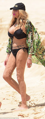 Though she still rocked a black bikini,this time,she threw on kimono over and let her hair down while protecting her face with a baseball cap.