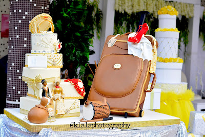Here’s the story behind the traditional wedding cake “The inspiration behind this cake ….well i tried to incorporate some elements peculiar to our own ceremony ..i love blings and we love the design of the ring from @eternalgems_ng , the beads from @perfectmelange was also incorporated into the design ,Of course not forgetting the Holy bible ..we the yorubas love music hence the talking drum , the palm wine beside it is peculiar to people from the south south …The big suspended luggage is for me , the bride leaving Lagos to Akwaibom of course with my aso oke from @eviritasooke and shoe from @carissasonline …..Inspiration comes from different source(s)… well captured by the boss!!!!@klalaphotography”