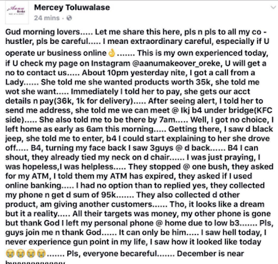 NEWS Woman recounts how she fell victim to the new robbery tactic used in Lagos By niyidaram Posted on October 24, 2017 Share Tweet Share Share Email Comments We all really need to be careful! Like this:Like Loading... Related Items: Share Tweet Share Share Email Click to comment Leave a Reply Cancel replyYour email address will not be published. Required fields are marked *Comment * Name * Email * Website Δ