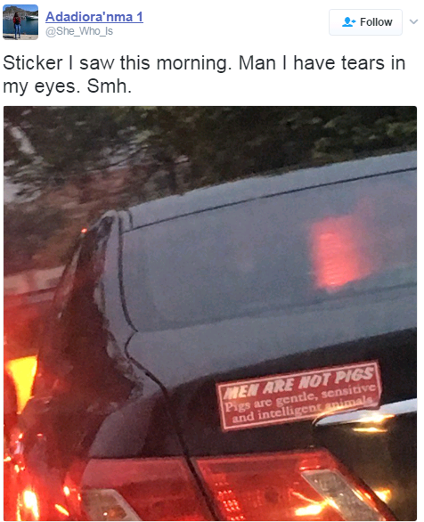 A Nigerian twitter user shared the above photo of a car sticker which says that pigs are better than men.